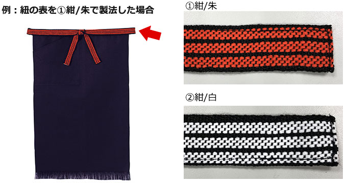 紐の色を2種類から選べます。正面を①紺/朱にした場合、裏は②紺/白になります。デザインにあわせてお選びください。