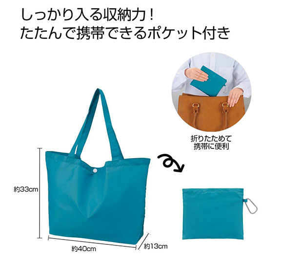 ビッグサイズで収納力抜群な上、折りたたんでカラビナ付き専用ポーチに入れるとコンパクトになるため、持ち歩きも便利なエコバッグです。オリジナルデザインによるフルカラー名入れプリントも可能な商品ですのでノベルティグッズから物販用まで、幅広いシーンにおすすめです。