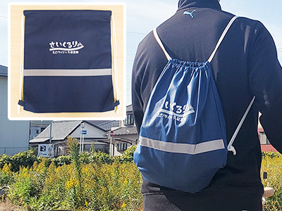 反射テープがついて防犯上も使いやすい巾着リュック!防災用のノベルティに最適!
