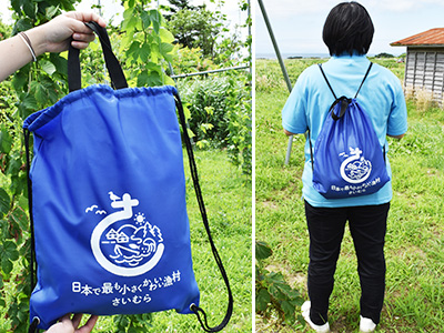 袋状の左右の端に取り付けられた紐を引くと巾着のように口が閉まり、さらにその紐で背負えることができるバッグです。リュックのように両手が自由になるため非常に便利で、部活やサークルのグッズからノベルティ、ショッパーなどまで広く利用されています。