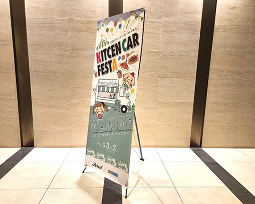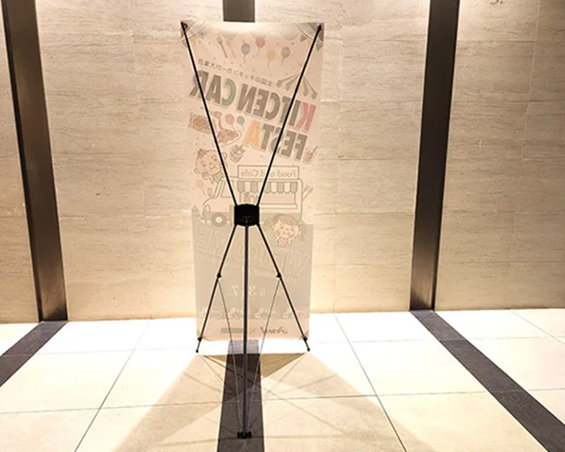 バナーXスタンドは、低コストでオリジナル作成を行えるPRツールであり、高さもある程度目立つ物があるので、隙間にフィットする様なサイズであれば、ご活用頂けるアイテムとなっております。