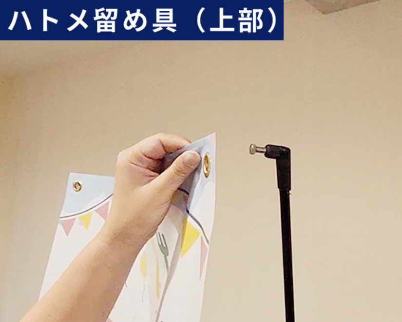 メディア上部のハトメを、上部パイプ先端のフックに引っ掛けます。またメディア下部のハトメは本体の脚についている留め具に引っ掛けてください。