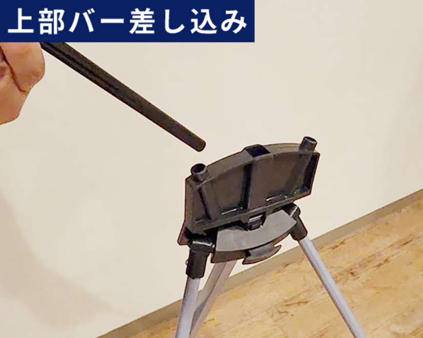 本体に上部パイプを差し込みます。この時、後ほどメディアを引っ掛けるフックが前になるように差し込んでください。長さがあるので周囲に注意して作業してください。