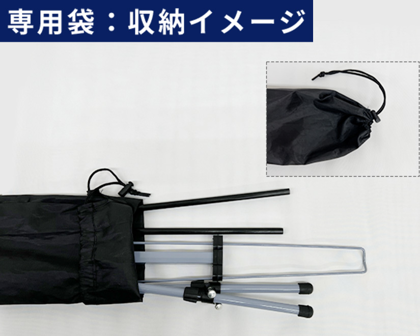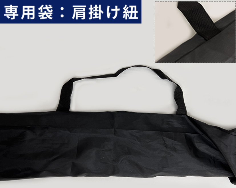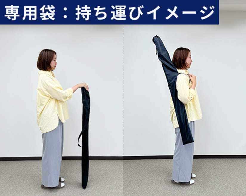 バナースタンドには全長約1300mmの専用の袋が付属しています。手で持ったり、肩に掛けることができる持ち手が付いているので、持ち運びも気軽に行えます。