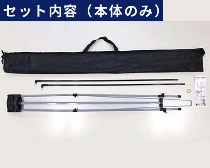 - 上部パイプ:2本、本体(接続パーツ+脚):1セット、専用収納袋:1つ、組み立て説明書:1枚