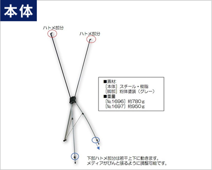 必要に応じて、本体脚の留め具の位置を調整し、メディアをしっかり貼ってください。メディアがピンと張れば完成です。