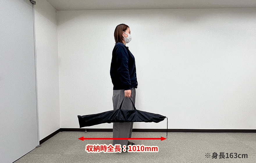 収納時の全長は1010mmで、コンパクトにまとまり女性1人でも持ち運び可能なサイズになります。肩掛けも可能な持ち手がついており、持ち運びにも便利です。