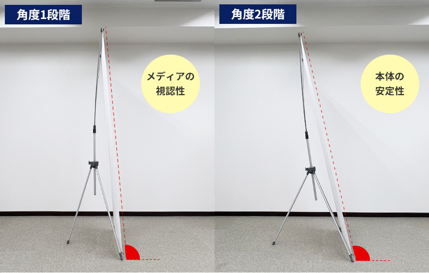 支柱の後ろ足が2段階に開く仕様で、本体の角度調整が可能です。視認性を優先した角度と、本体の安定性を高めた角度の2パターンあり、用途に応じてご使用いただけます。