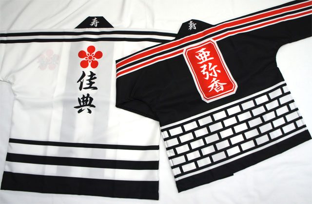 新婦様用は昔ながらの煉瓦柄を腰部分に入れた黒地に袖から肩、反対側の袖までに赤と白のラインを入れ、衿の前面と背面に、そして背面中央にデザインをお入れいたしました。