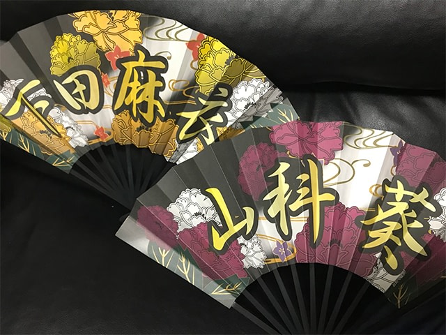 特徴的と思ったのは枚数です。なんと25枚もの製作オーダーを頂きました。すべて名前を差し替えてお作りしました。見事な出来栄えです。素材には両貼り扇子を採用しましたが、片面にのみプリントを施すことにしました。