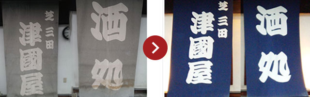 経年や設置環境の影響で生地が損傷し、日焼けしてしまったのれんを書体とデザインもそのままで復元。お客様が長く使えるように厚手でしっかりした綿素材の生地と、直射日光による色褪せに強い顔料プリントの使用を提案させていただきました。