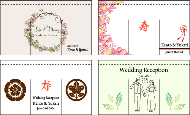 結婚式・ウェルカムのれんと一言に言ってもデザインに特に決まりはありません。新郎様、新婦様のご趣味や思い出をイラストにしてのれんに配置したり、両家を象徴する家紋やお名前を入れたのれんも人気があります。お客様のご要望をお気軽にお伝え下さい!