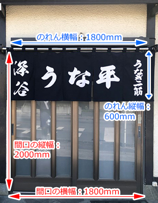 店舗の間口が幅1800×縦2000mmの場合、暖簾の横幅は、間口と同じサイズの幅1800mmにすると収まりが良くなります。暖簾の高さは出入りの邪魔にならない寸法、間口の1/3~1/4程度の長さ(400~600mm)が人気です。