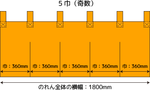巾とは読み方で(はば)と言い、のれん生地に入る切れ目(スリット)によって分割された布の部分を指します。つまるところ、分割数=巾数となります。巾数はデザインや縁起、機能面で数が決まってくるため、以下のことを参考に巾数を決定してください。