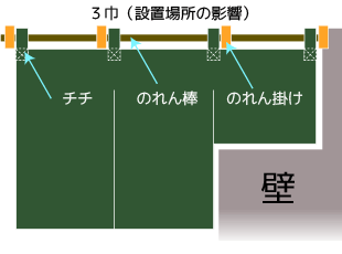 のれんの設置場所の制限により、巾数をその環境に合わせて決まる場合があります。例えば、のれん掛けの位置によってチチと言われる暖簾棒を通す筒状の布の位置も左右されます。スリットは一般的にチチの真下に入るので、自ずと巾数が決まります。
