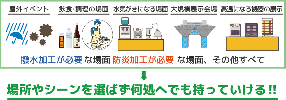 展示会やイベントで使用するテーブルクロスを、お手頃価格でフルオーダー作成致します。生地や印刷方法も豊富!まずはお気軽にご相談下さい!